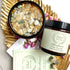 La bougie précieuse Abondance est composée de citrine, de jade, de pyrite, de poudre de riz et de cannelle.