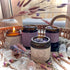 La bougie précieuse Méditation est composée de cristaux naturels d'améthyste, de fleur de lavande, d'encens et de bois de Gaiac.