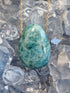 La pierre est en forme de goutte ovale, percée, avec un trou de chaque côté pour y mettre une chaîne ou un cordon pour en faire un collier.