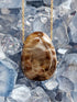 La pierre est en forme de goutte ovale, percée, avec un trou de chaque côté pour y mettre une chaîne ou un cordon pour en faire un collier.