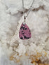 La pierre est en forme de goutte ovale, percée, avec un trou de chaque côté pour y mettre une chaîne ou un cordon pour en faire un collier.