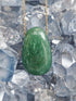 La pierre est en forme de goutte ovale, percée, avec un trou de chaque côté pour y mettre une chaîne ou un cordon pour en faire un collier.