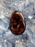 La pierre est en forme de goutte ovale, percée, avec un trou de chaque côté pour y mettre une chaîne ou un cordon pour en faire un collier.