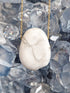 La pierre est en forme de goutte ovale, percée, avec un trou de chaque côté pour y mettre une chaîne ou un cordon pour en faire un collier.