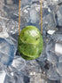 La pierre est en forme de goutte ovale, percée, avec un trou de chaque côté pour y mettre une chaîne ou un cordon pour en faire un collier.