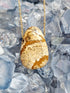 La pierre est en forme de goutte ovale, percée, avec un trou de chaque côté pour y mettre une chaîne ou un cordon pour en faire un collier.