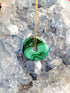 La pierre est en forme de goutte ovale, percée, avec un trou de chaque côté pour y mettre une chaîne ou un cordon pour en faire un collier.
