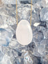 La pierre est en forme de goutte ovale, percée, avec un trou de chaque côté pour y mettre une chaîne ou un cordon pour en faire un collier.