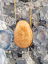 La pierre est en forme de goutte ovale, percée, avec un trou de chaque côté pour y mettre une chaîne ou un cordon pour en faire un collier.