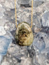 La pierre est en forme de goutte ovale, percée, avec un trou de chaque côté pour y mettre une chaîne ou un cordon pour en faire un collier.
