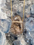 La pierre est en forme de goutte ovale, percée, avec un trou de chaque côté pour y mettre une chaîne ou un cordon pour en faire un collier.