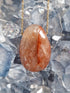 La pierre est en forme de goutte ovale, percée, avec un trou de chaque côté pour y mettre une chaîne ou un cordon pour en faire un collier.