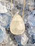 La pierre est en forme de goutte ovale, percée, avec un trou de chaque côté pour y mettre une chaîne ou un cordon pour en faire un collier.