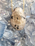 La pierre est en forme de goutte ovale, percée, avec un trou de chaque côté pour y mettre une chaîne ou un cordon pour en faire un collier.