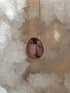 La pierre est en forme de goutte ovale, percée, avec un trou de chaque côté pour y mettre une chaîne ou un cordon pour en faire un collier.