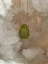 La pierre est en forme de goutte ovale, percée, avec un trou de chaque côté pour y mettre une chaîne ou un cordon pour en faire un collier.