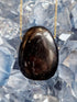 La pierre est en forme de goutte ovale, percée, avec un trou de chaque côté pour y mettre une chaîne ou un cordon pour en faire un collier.